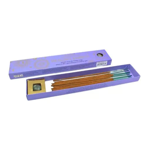 "Lavendelwierook voor helende energie, versterkt met een verjongende groene aventurijn edelsteen."